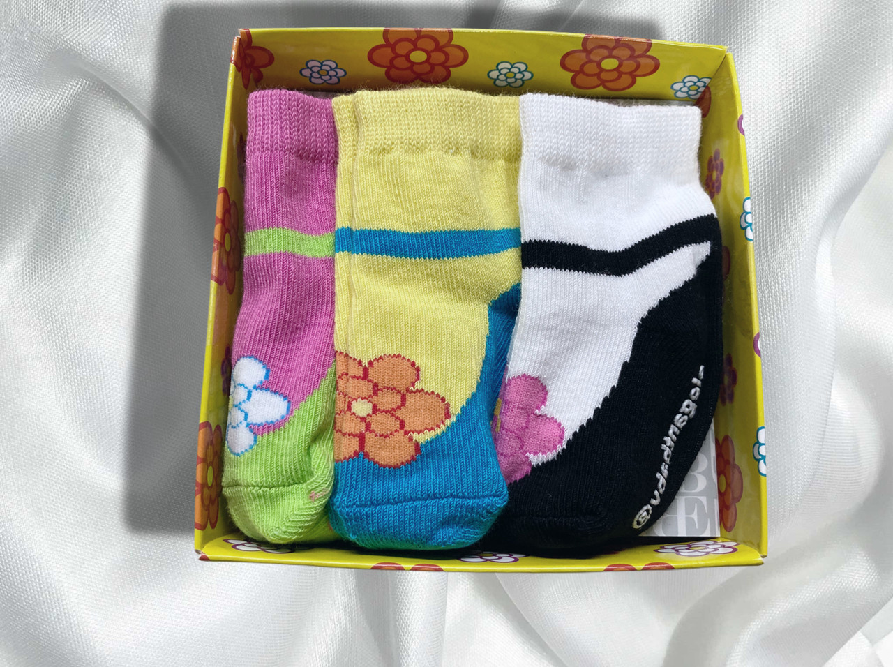 This is an adorable set of 3 baby socks in a gift box ready to wrap.These are vibrantly colored socks with a Hawaiian flower design.This is a great add on to a baby shower gift.Made of organic cotton.