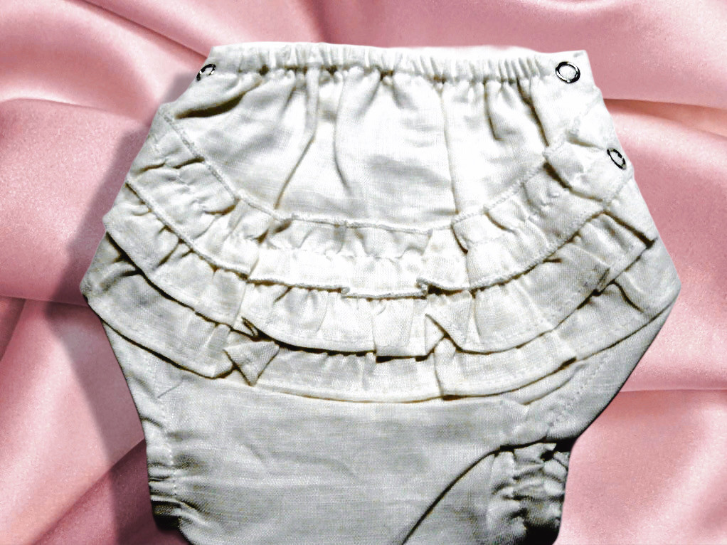 Adorable ruffled bums!Keep your little girls diaper covered with this linen, ruffled diaper cover.Fits 0 - 6 months, ivory linen color.