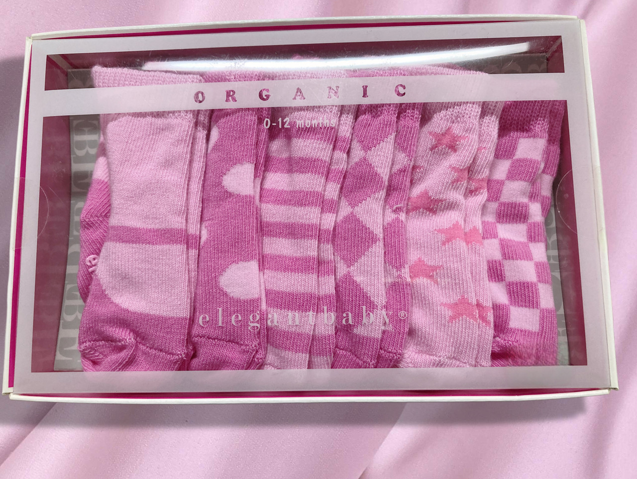 This gift set includes 6 pairs of pink baby socks ready to be gift wrapped.Each pair of socks has a different design in shades of pink.Made of organic cotton.