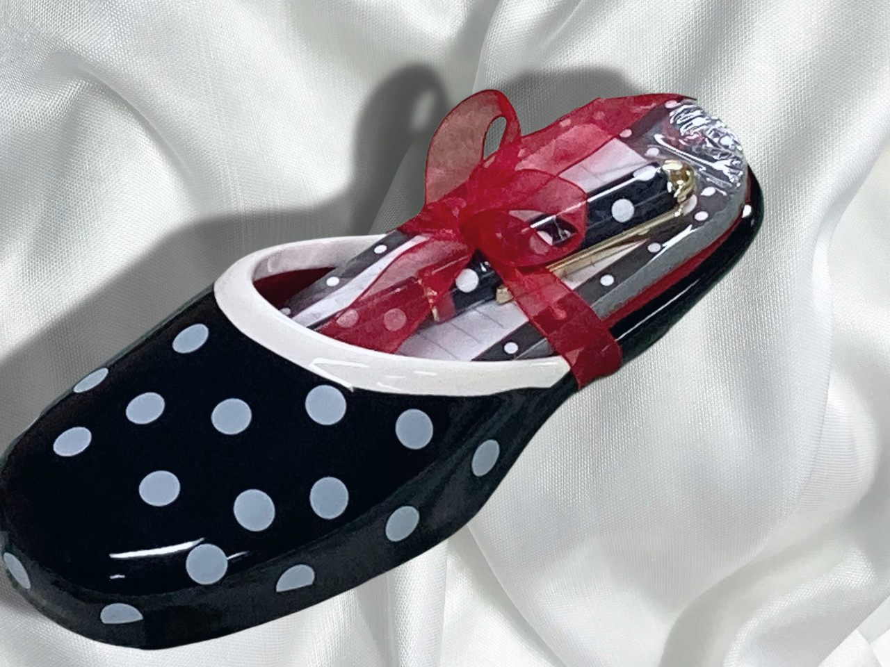 This a lovely gift for mom.It is practical & cute.This is a polka dot black & white ceramic shoe that is holding a notepad & pen inside of it.Arrives in a gift box ready to be wrapped.