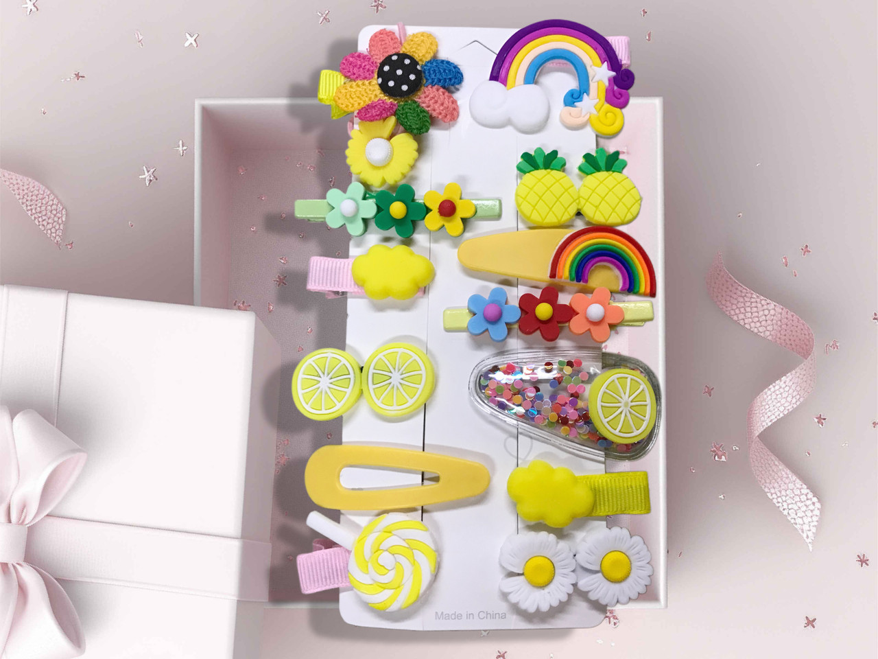Adorable assortment of 14 bright multi - color hair clips,not only adorable but also affordable.These barrettes are handmade in China.Included is a variety of designs of fruits,lollipops,rainbows & flowers,clods, & lemons.Oh my,what a great variety.