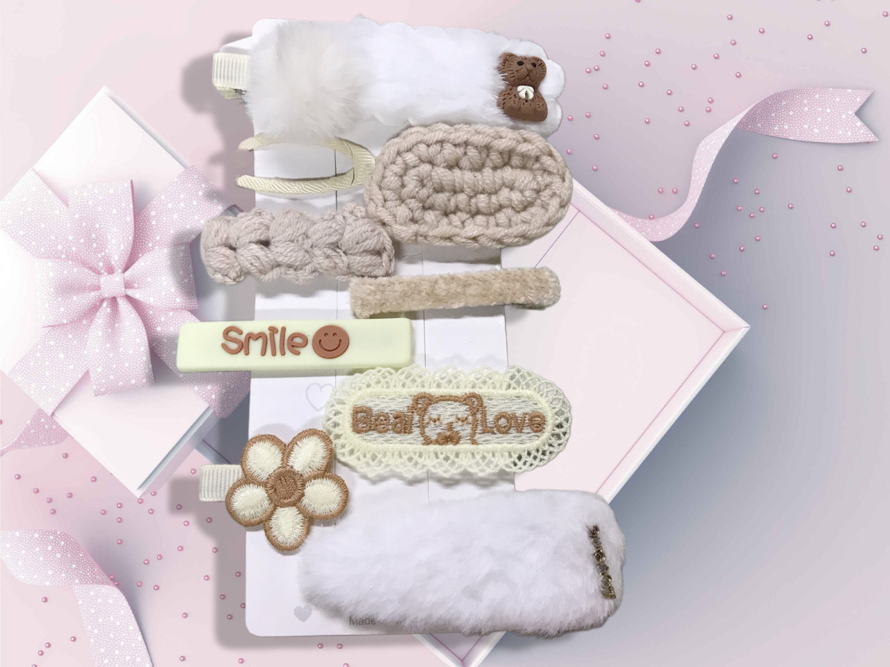 Adorable assortment of 9 snowy white & shades of beige hair barrettes ,not only adorable but also affordable.These barrettes are handmade in China.Included is a variety of designs of fluffy white fur & bears.