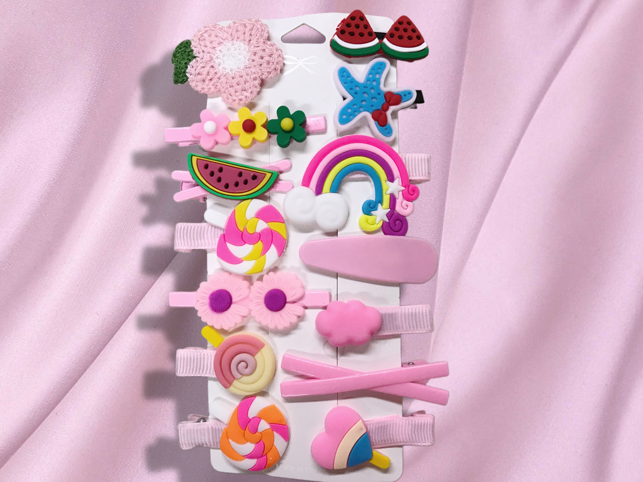 Adorable assortment of 14 pink multi - color hair barrettes ,not only adorable but also affordable.These barrettes are handmade in China.Included is a variety of designs of fruits,lollipops,rainbows & flowers.